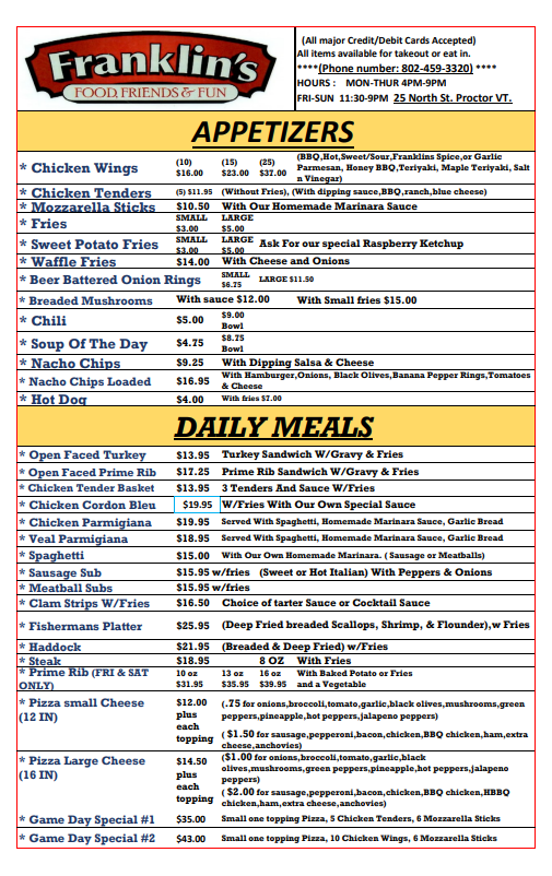 In addition, also offer daily specials that add excitement and variety to your dining experience. You can start your week with a delicious pizza and beer on Monday, build your own pasta or tacos on Tuesday, or enjoy our famous wings at half-price on Sunday. And don’t miss our prime rib on Friday and Saturday, a local favorite that’s slow-roasted to perfection! With something new to try every day, Franklin’s is the perfect place to gather with friends and family for a meal that’s always satisfying and full of flavor.